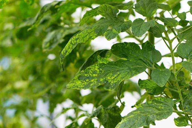- Gelbe (chlorotische) und braune (nekrotische) Mosaikflecken auf den Blättern