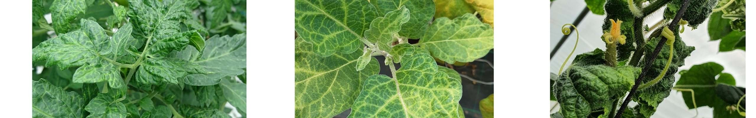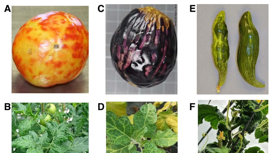 Figuur boven. Afbeeldingen van natuurlijke PhCMoV besmettingen in tomaat, aubergine en komkommer. A&B: symptomen van PhCMoV op een tomaat en op het tomatenblad. C&D: symptomen van PhCMoV op een aubergine en op het blad van de aubergineplant. E&F: symptomen van PhCMoV op een komkommer en op het blad van de komkommerplant. Copyright © 2022 The Authors. DOI: https://doi.org/10.1094/PDIS-12-21-2800-RE